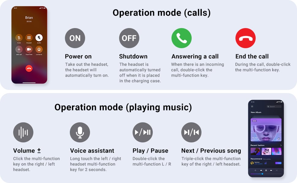 • [ENC Noise Canceling & HiFi Stereo Sound ] Wireless earphones with microphone equip ENC noise canceling and software call noise reduction algorithm, making the call sound quality clearer. Bluetooth earbuds have titanium dome composite diaphragms with moving coil speakers. The hi-fi stereo sound of the wireless earbuds provides a wider sound field and a shockingly low-frequency experience.